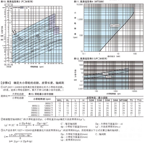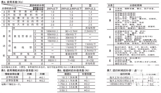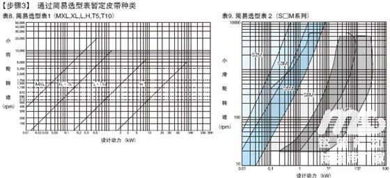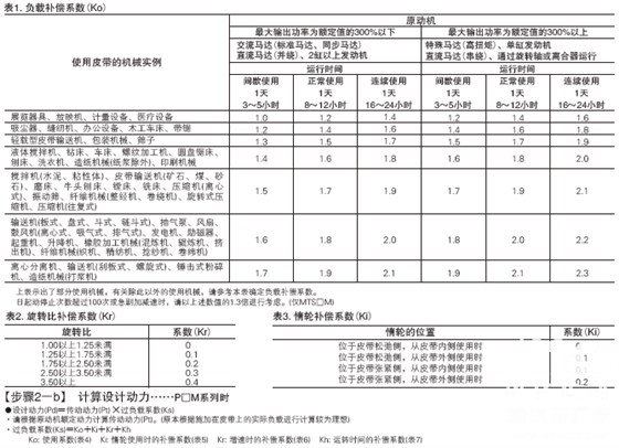 9、其他使用條件 【步驟2-a】 計算設計動力……MXL/XL/L/H/S□M/MTS□M系列時 ●設計動力(Pd)=傳動動力(Pt) M過負載系數(Ks) ·請根據原動機額定動力計算傳動動力(Pt)。(原本根據施加在皮帶上的實際負載進行計算較為理想) ·過負載系數(Ks)=Ko+Kr+Ki Ko: 負載補償系數(表1) Kr: 旋轉比補償系數(表2) Ki: 惰輪補償系數(表3)