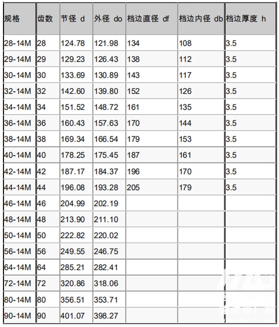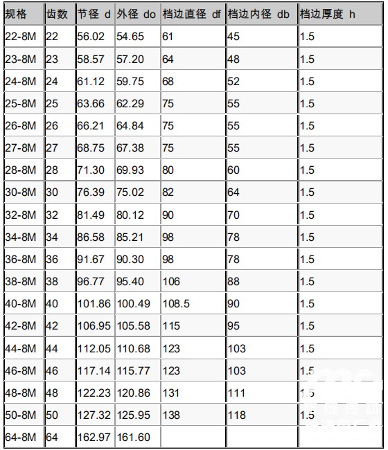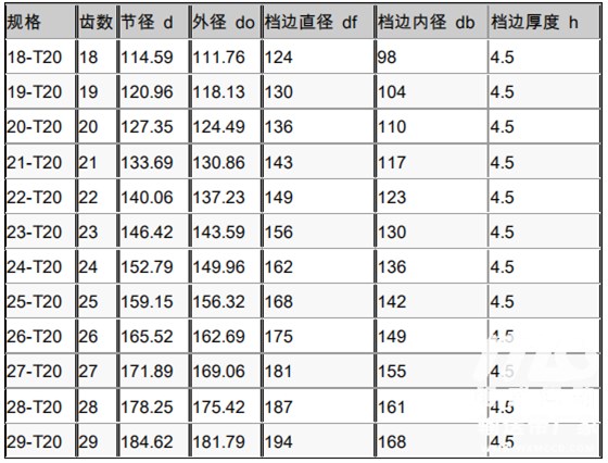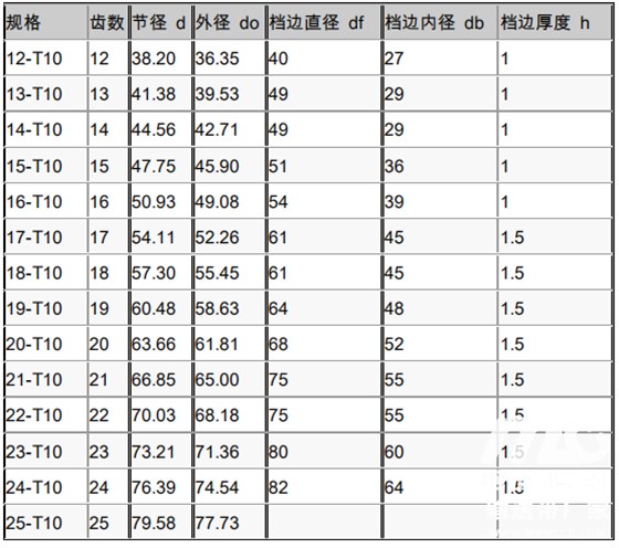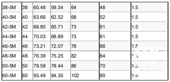 同步帶輪 的規格型號比較多,銘成為您列舉一些規格型號表格 同步帶是以鋼絲繩或玻璃纖維為強力層,外覆以聚氨酯或氯丁橡膠的環形帶,帶的內周制成齒狀,使其與齒形帶輪嚙合。同步帶傳動時,傳動比準確,對軸作用力小,結構緊湊,耐油,耐磨性好,抗老化性能好,一般使用溫度-20℃―80℃,v<50m/s,P<300kw,i<10,對于要求同步的傳動也可用于低速傳動。 同步帶傳動具有以下特點: (1)傳動準確,工作時無滑動,具有恒定的傳動比; (2)傳動平穩,具有緩沖、減振能力,噪聲低; (3)傳動效率高,可達 0.98,節能效果明顯; (4)維護保養方便,不需潤滑,維護費用低; (5)速比范圍大,一般可達 10,線速度可達 50m/s,具有較大的功率傳遞范圍,可達幾瓦到幾百千瓦; (6)可用于長距離傳動,中心距可達 10m 以上。 工業同步帶的型號: “T”型齒工業用同步帶