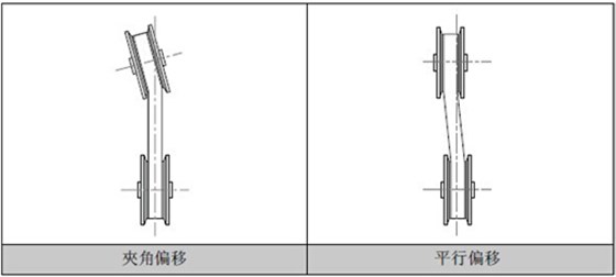 當主,從動輪軸線平行,但兩帶輪不在同一平面上時,引發平行偏移現象。當兩輪軸線不平行時即為夾角式偏移。